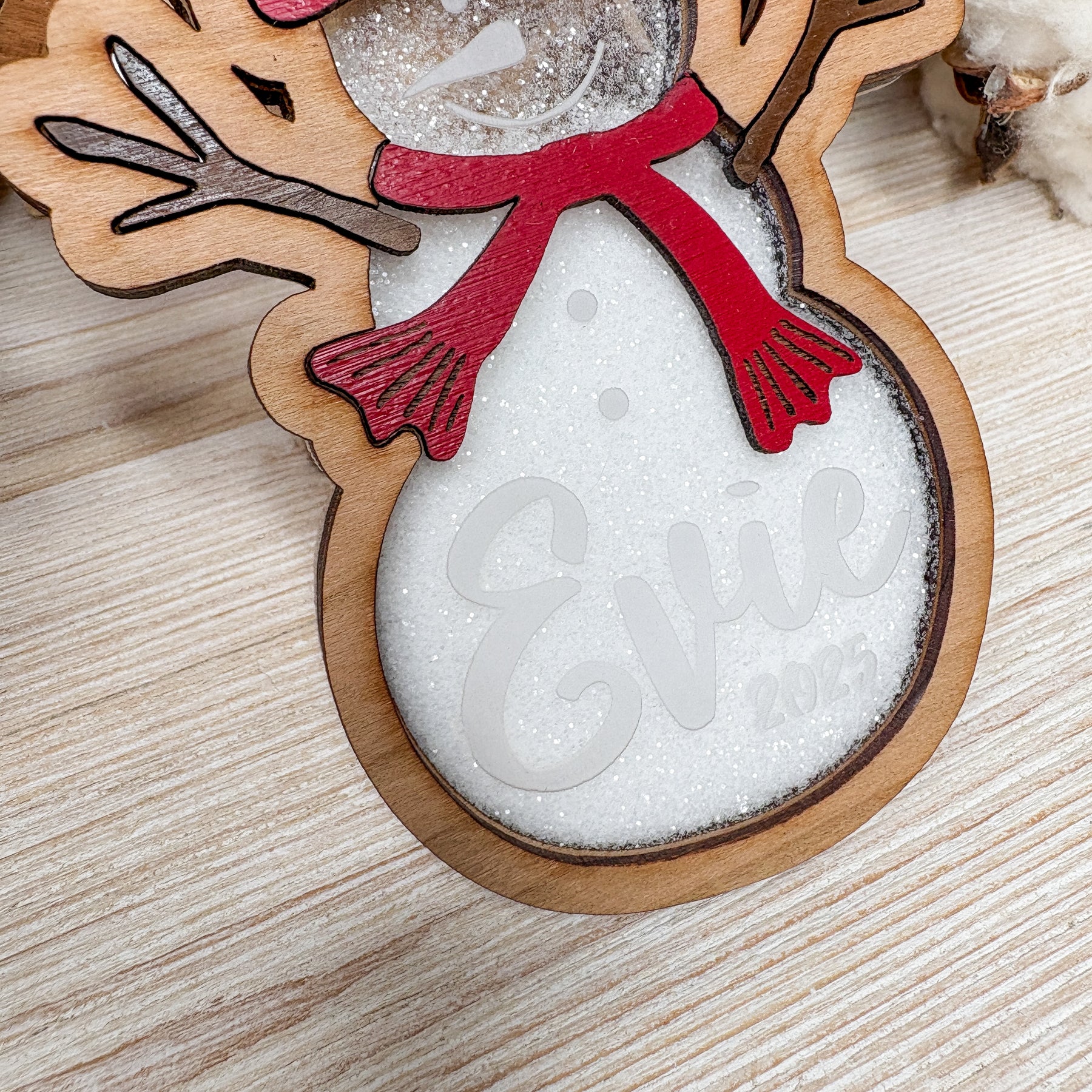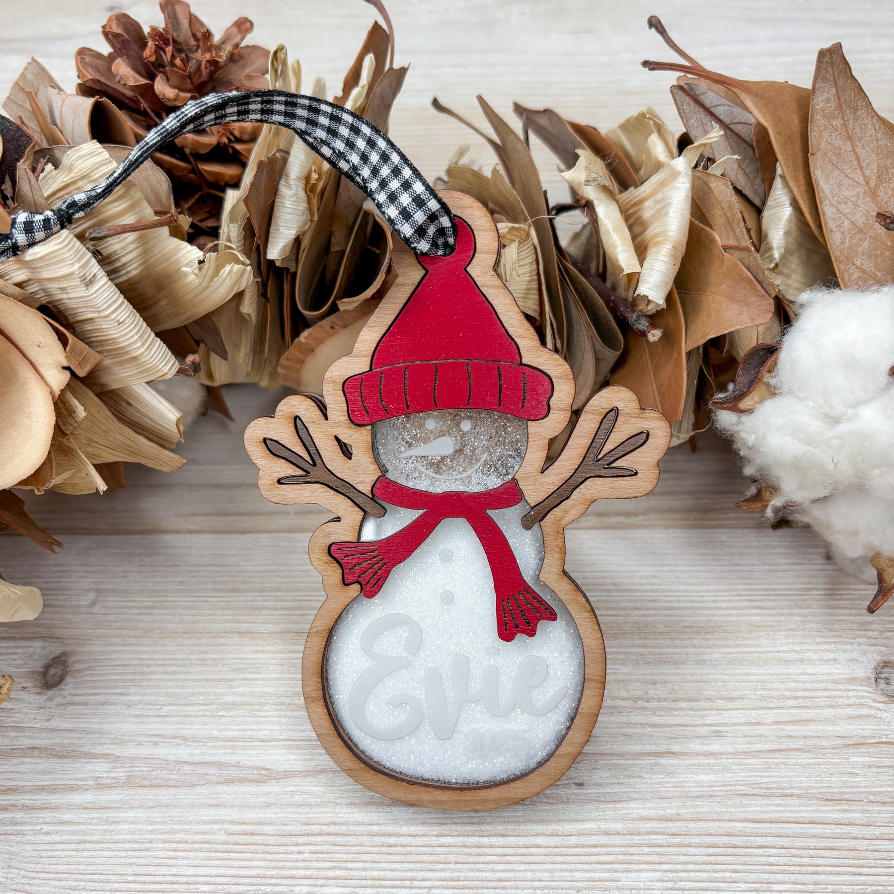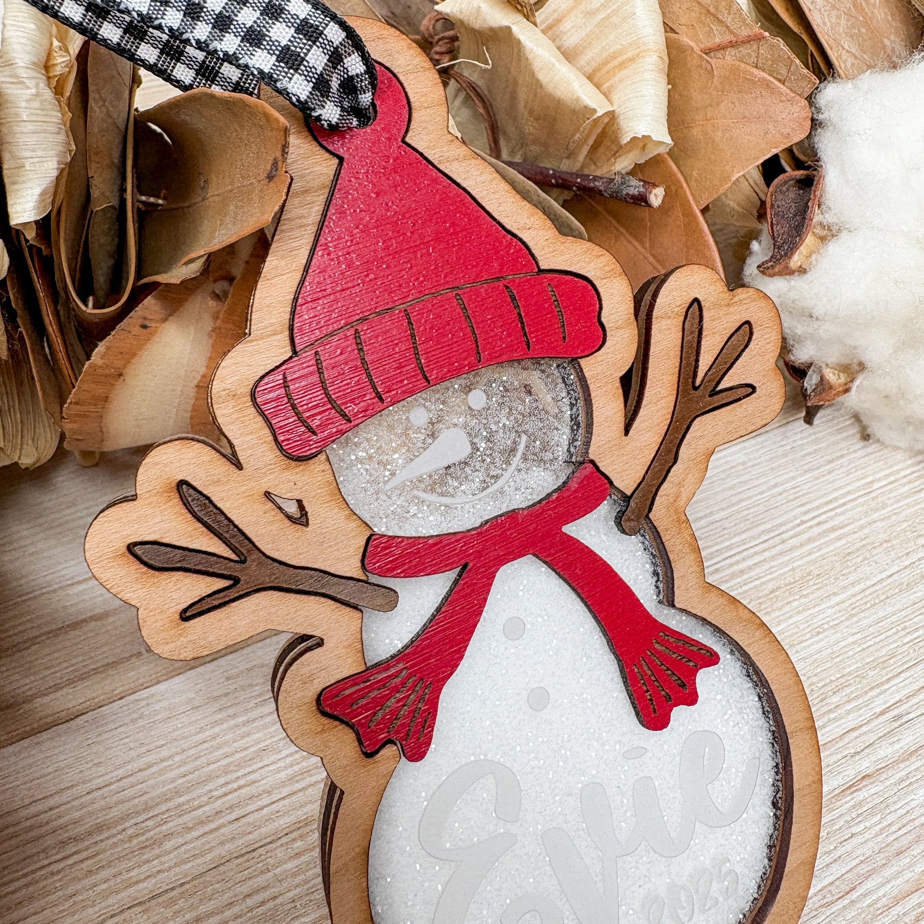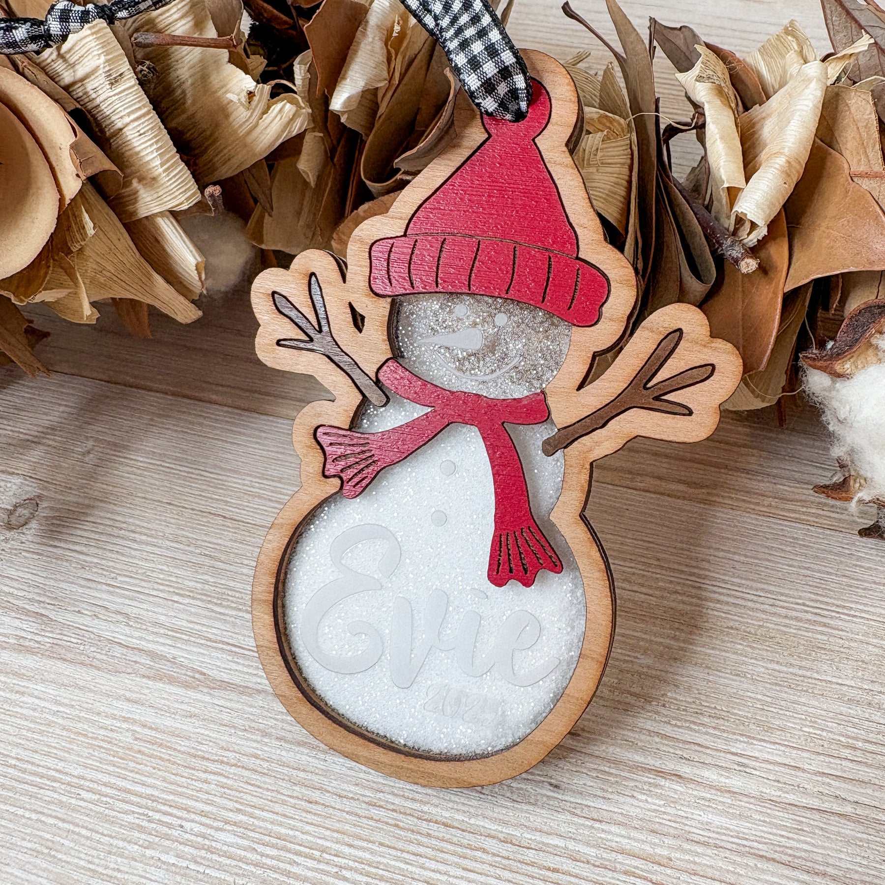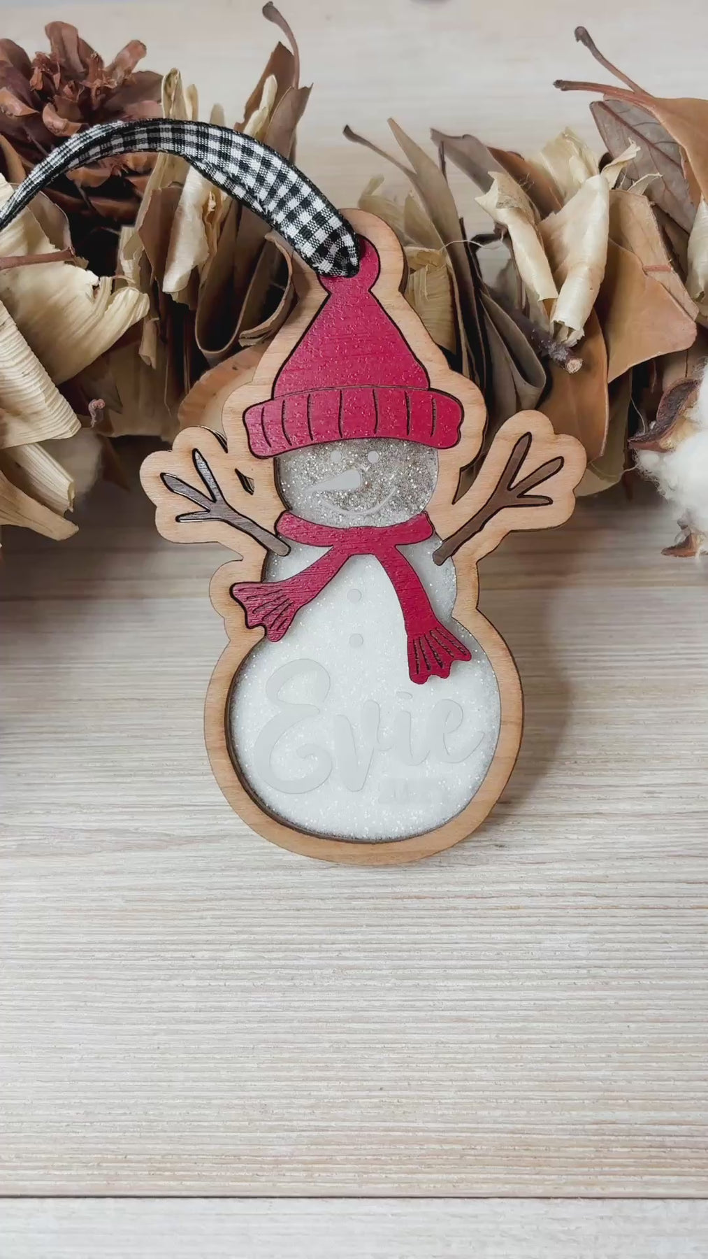 These charming snowman glitter shaker ornaments are crafted from four layers of solid cherry and walnut hardwood combined with clear acrylic for a stunning, durable design. The layered construction creates depth, while the clear acrylic allows your tree lights to shine through beautifully, adding a warm glow to your holiday décor. Personalized with your name of choice, these ornaments make a unique and meaningful addition to your festive celebrations or a thoughtful gift that will be cherished for years to come.
